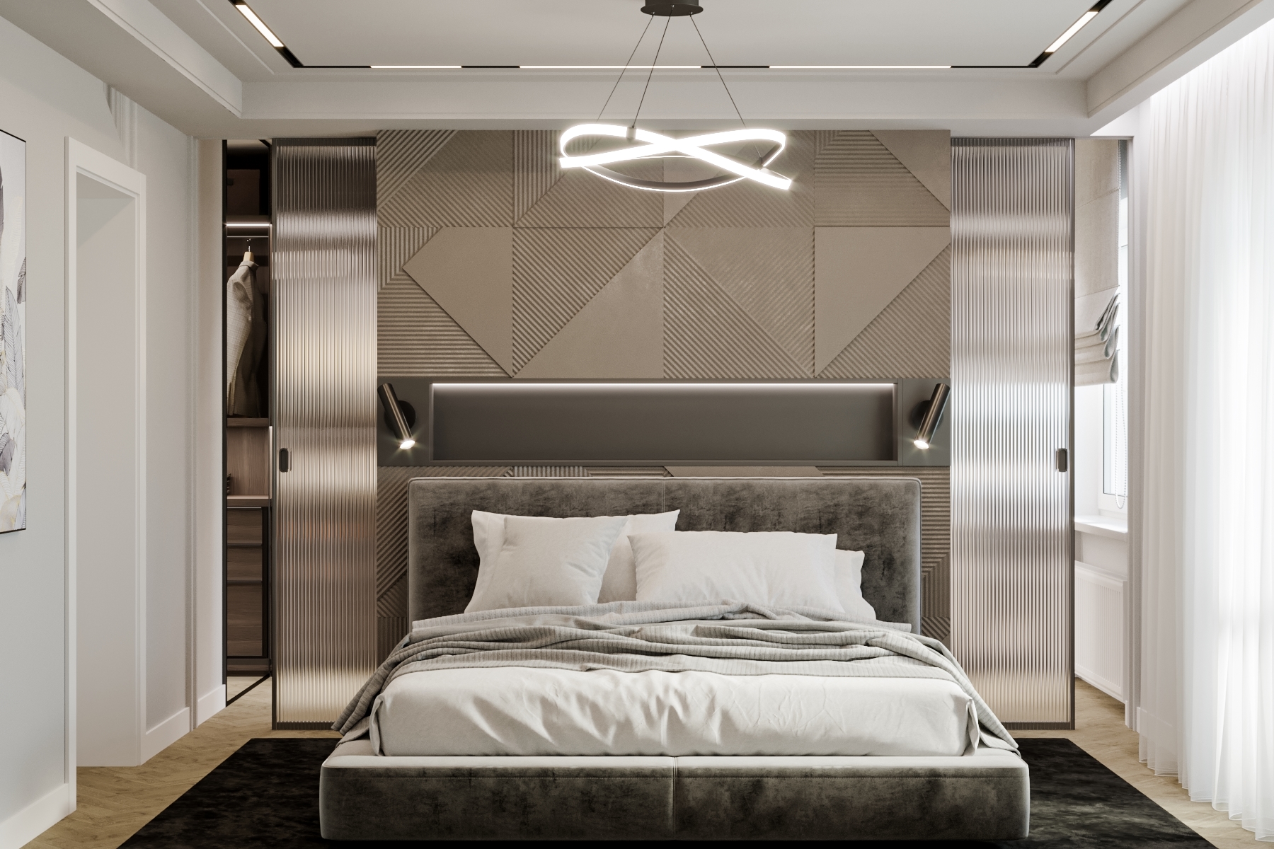 Единственный способ сделать такую гардеробную – это урезать площадь спальни вглубь помещения и соорудить стену прямо за изголовьем двуспальной кровати. Вариант более чем удобный даже для однокомнатных квартир, ведь никаких серьезных работ по возведению стен не потребуется.