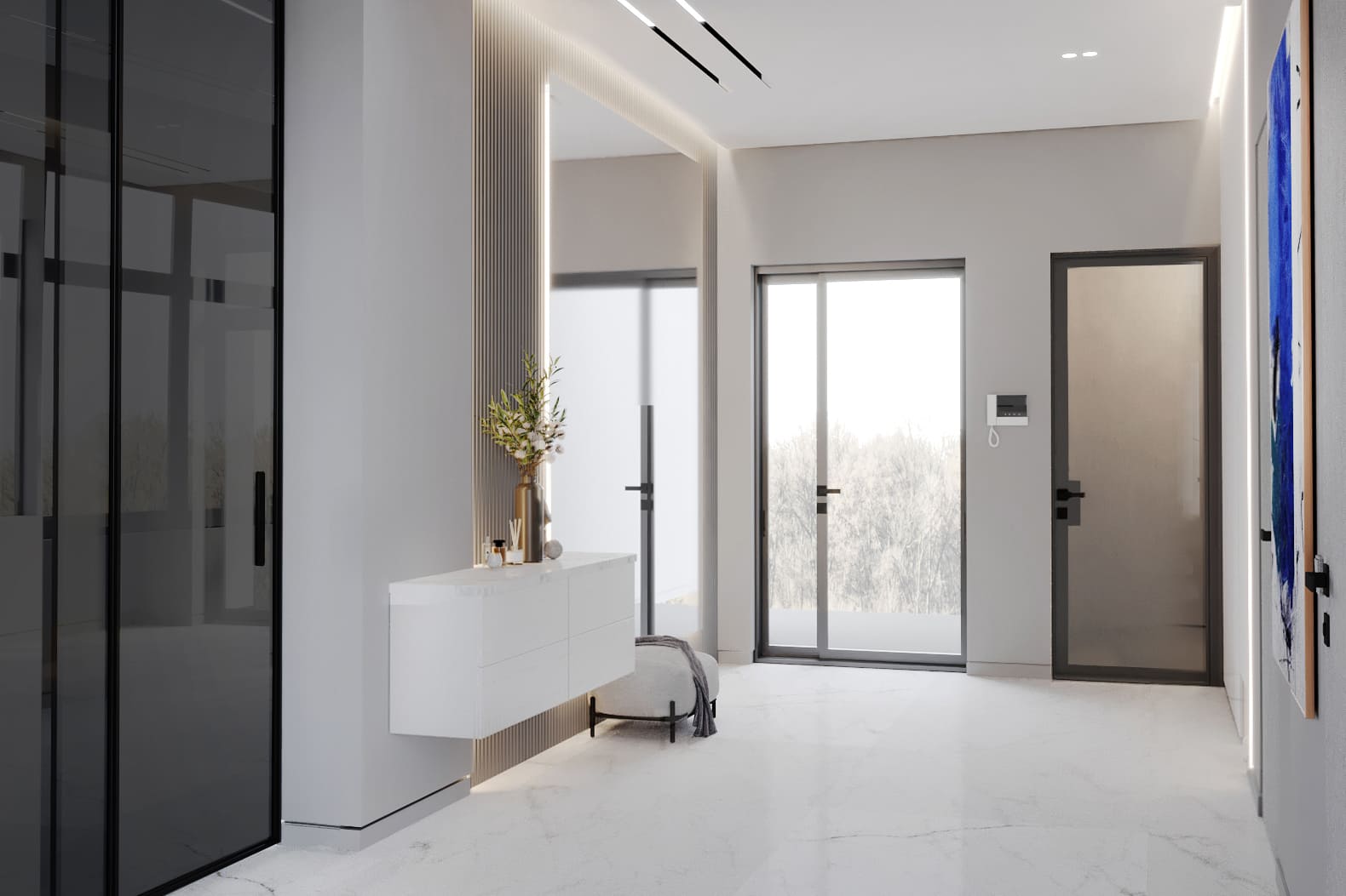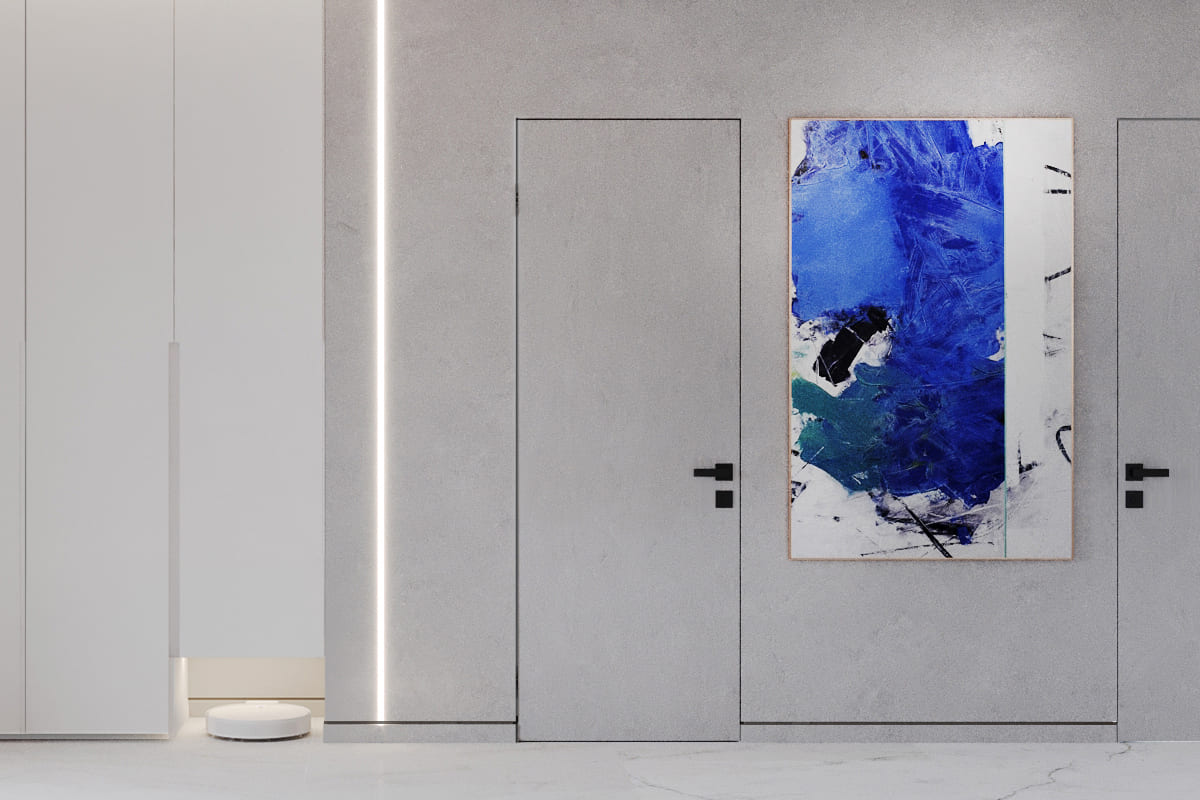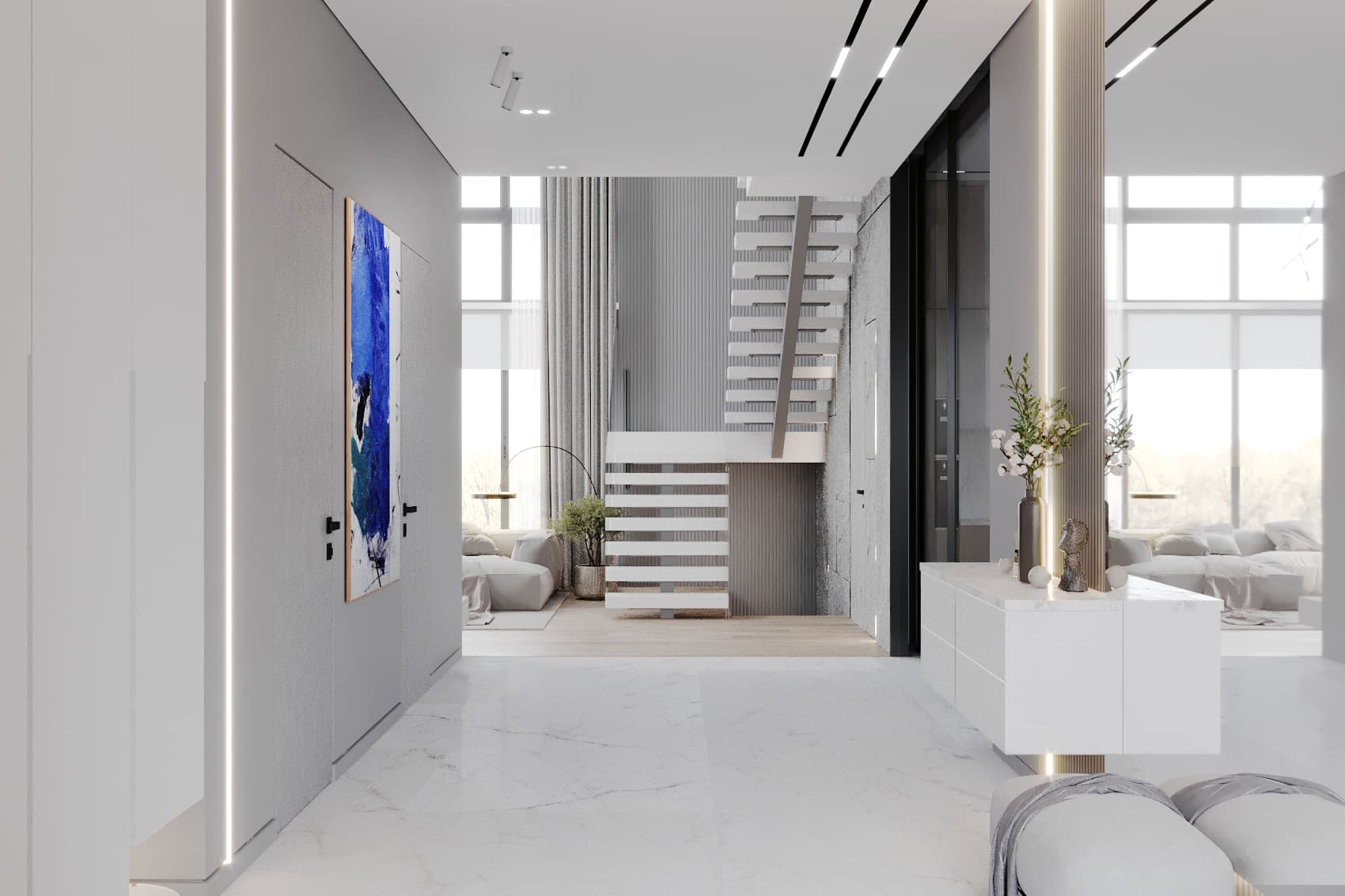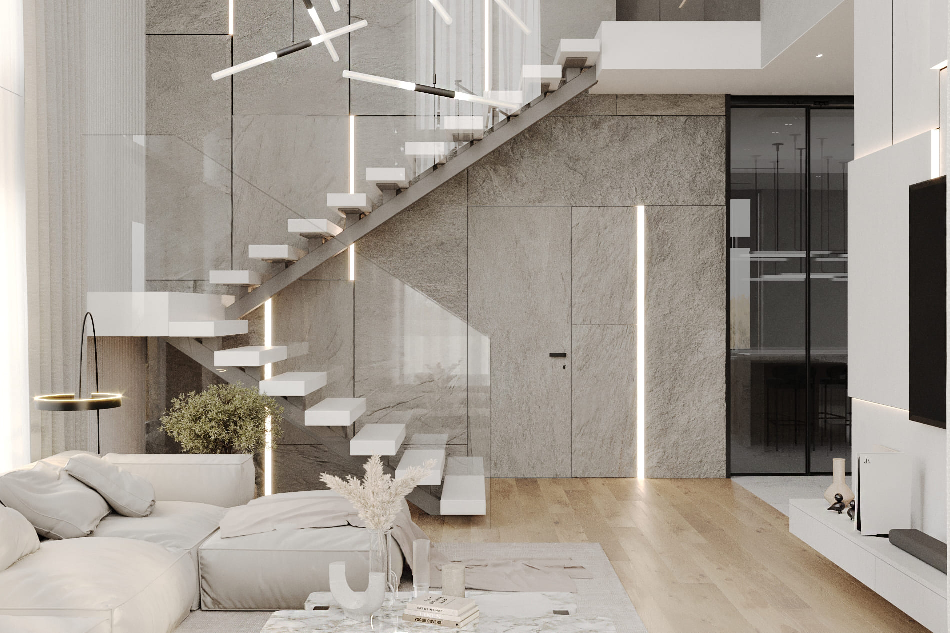 Из гостиной переход на 2-ой этаж по лестнице, которая получилась невесомой, воздушной и парящей. Стену за ней мы решили сделать из каменного шпона со вставками световых линий. Благодаря камню зона лестницы выглядит благороднее и роскошнее.