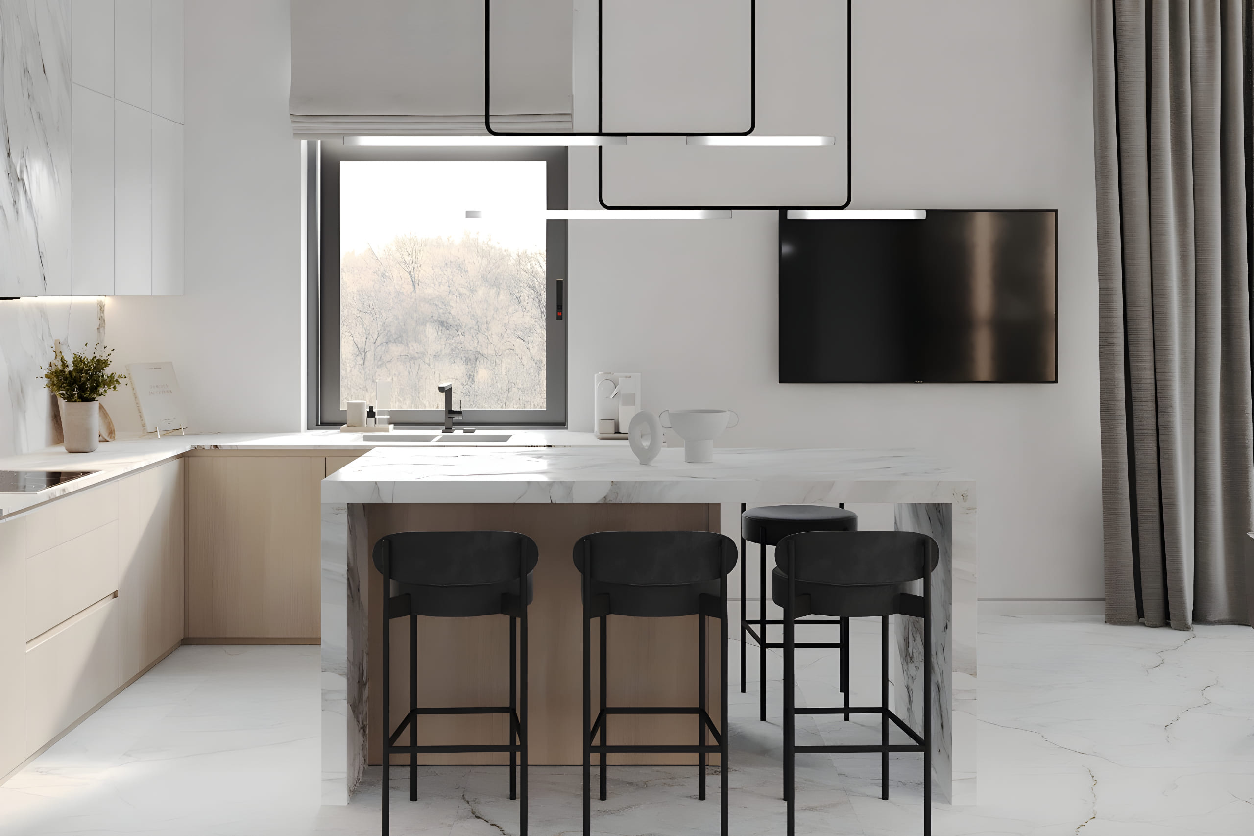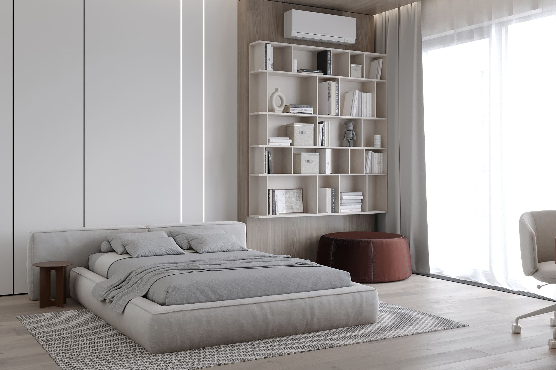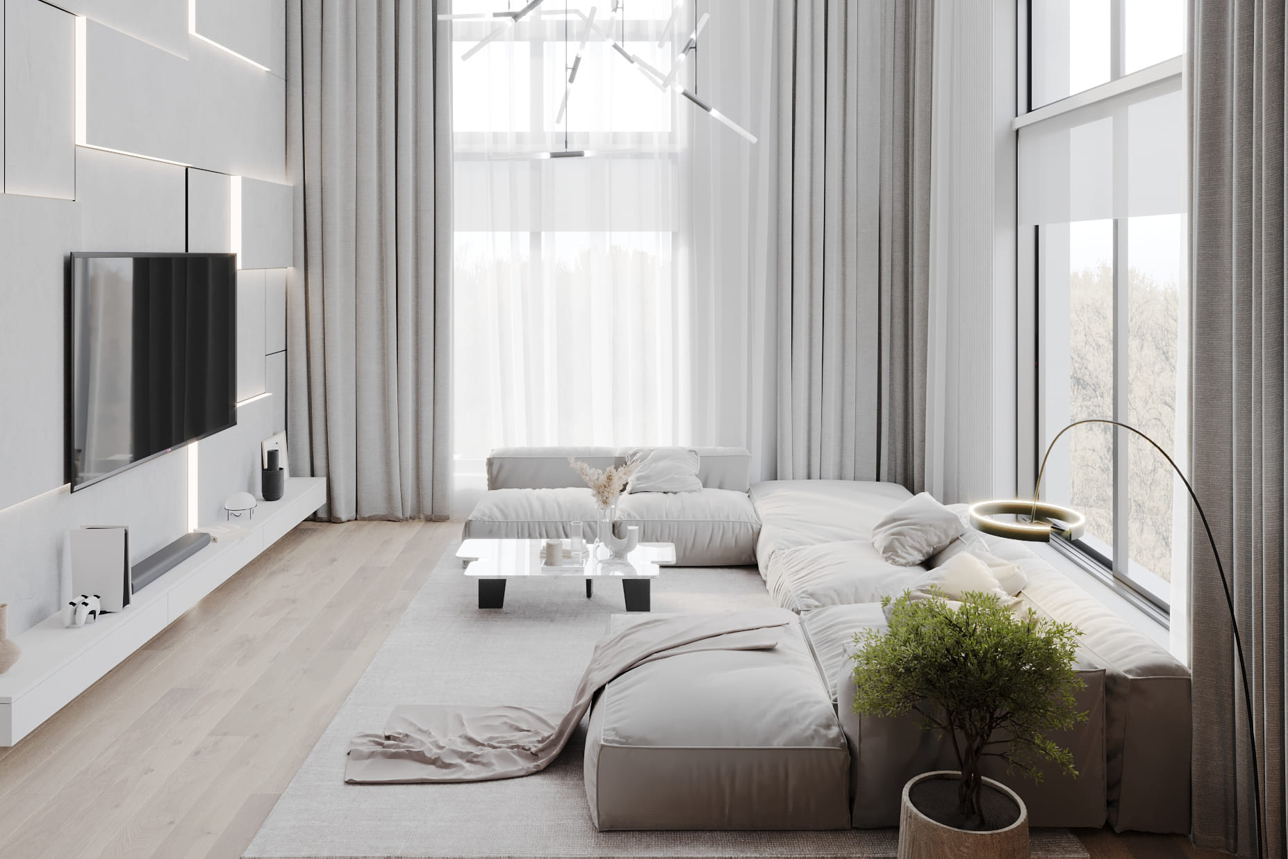 В главной комнате, в гостиной, мы предусмотрели открытие штор и рулонных штор на электрокарнизе. В центре помещения располагается большой модульный диван и ТВ. ТВ-зону решили интересно обыграть 3D панелями со встроенной подсветкой.