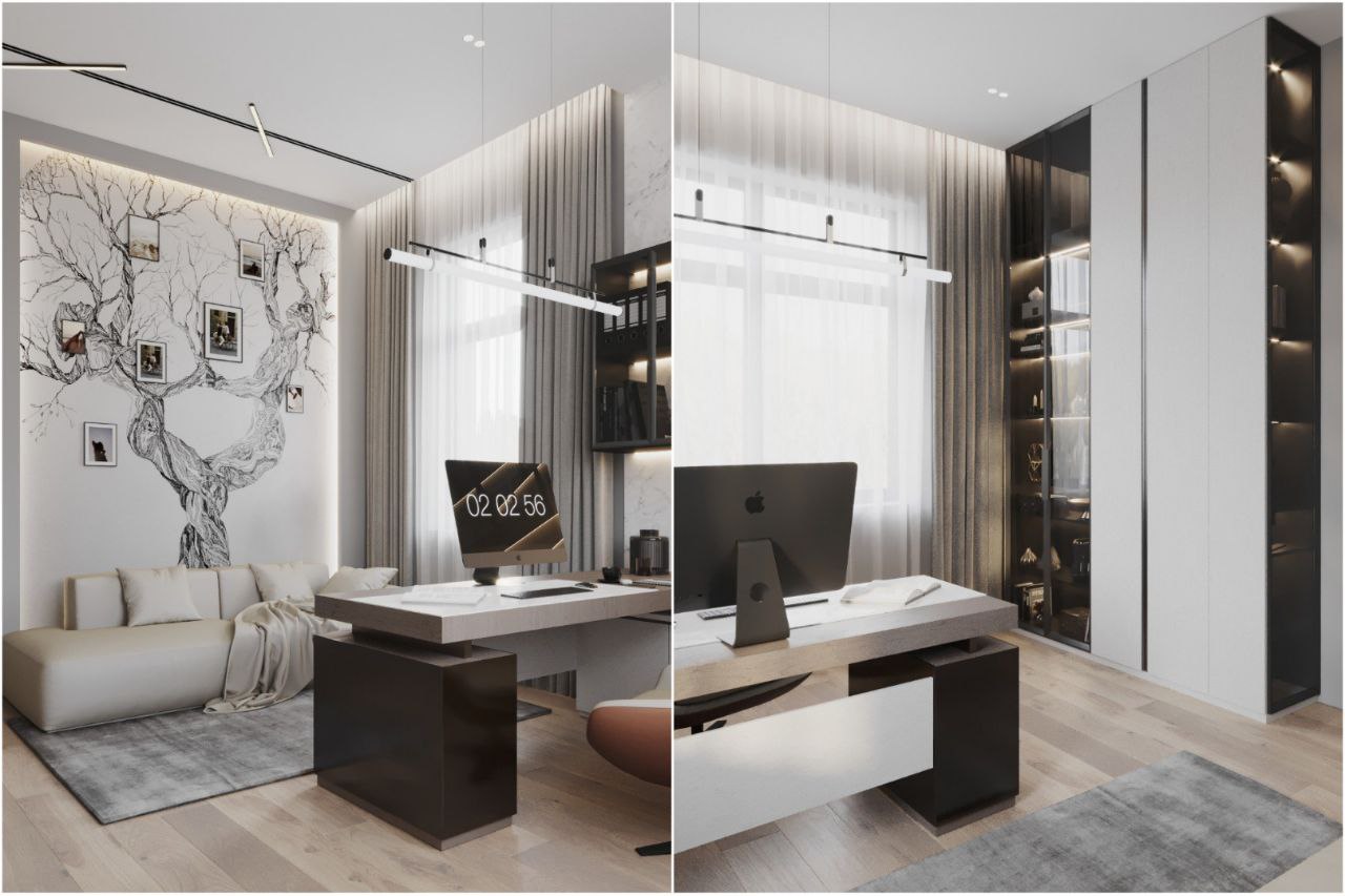 Особенность проекта: также основным пожеланием клиентов было сделать «древо жизни», которое имеет глубокий смысл для семьи. Его мы разместили в рабочем кабинете.