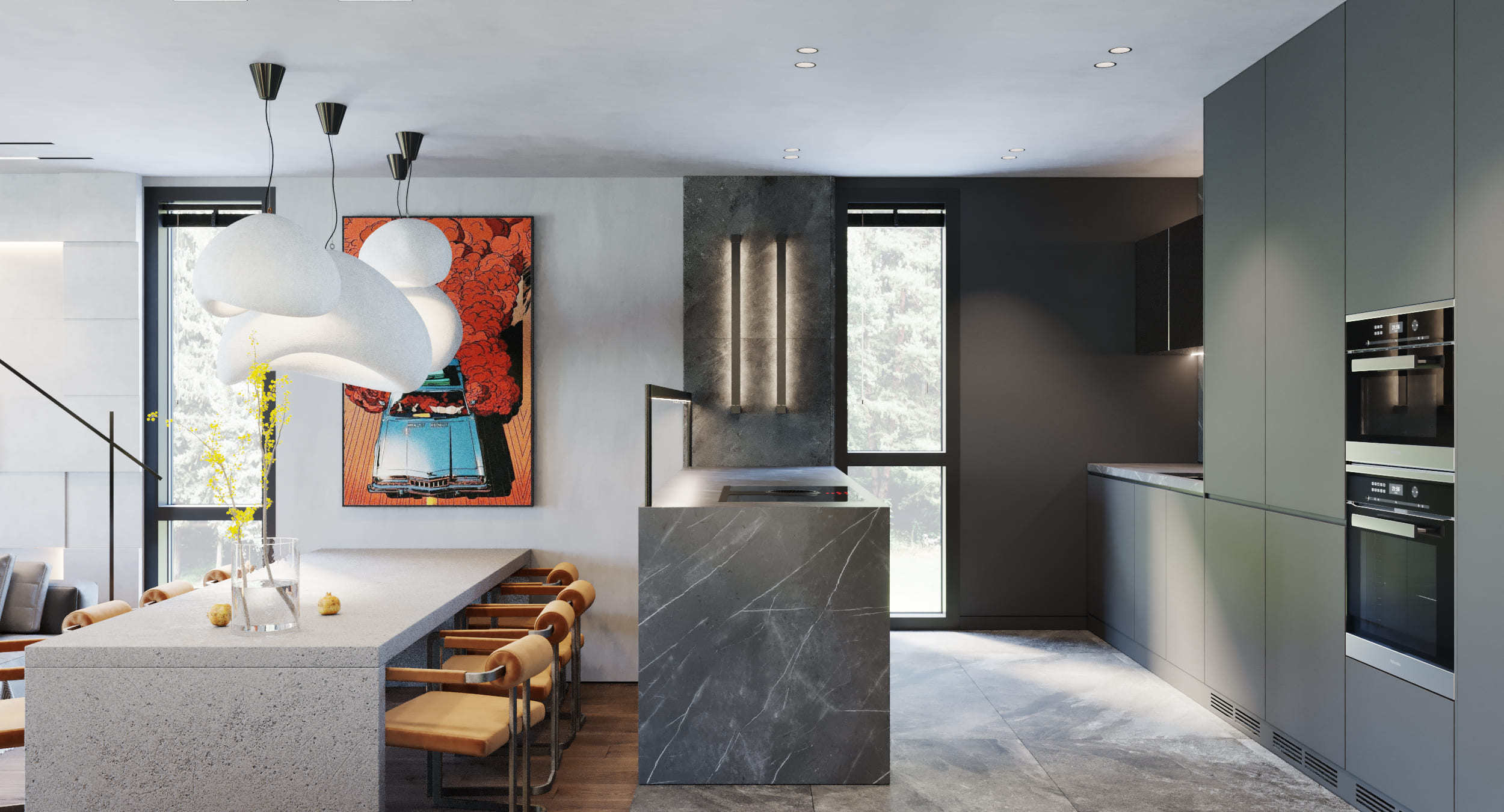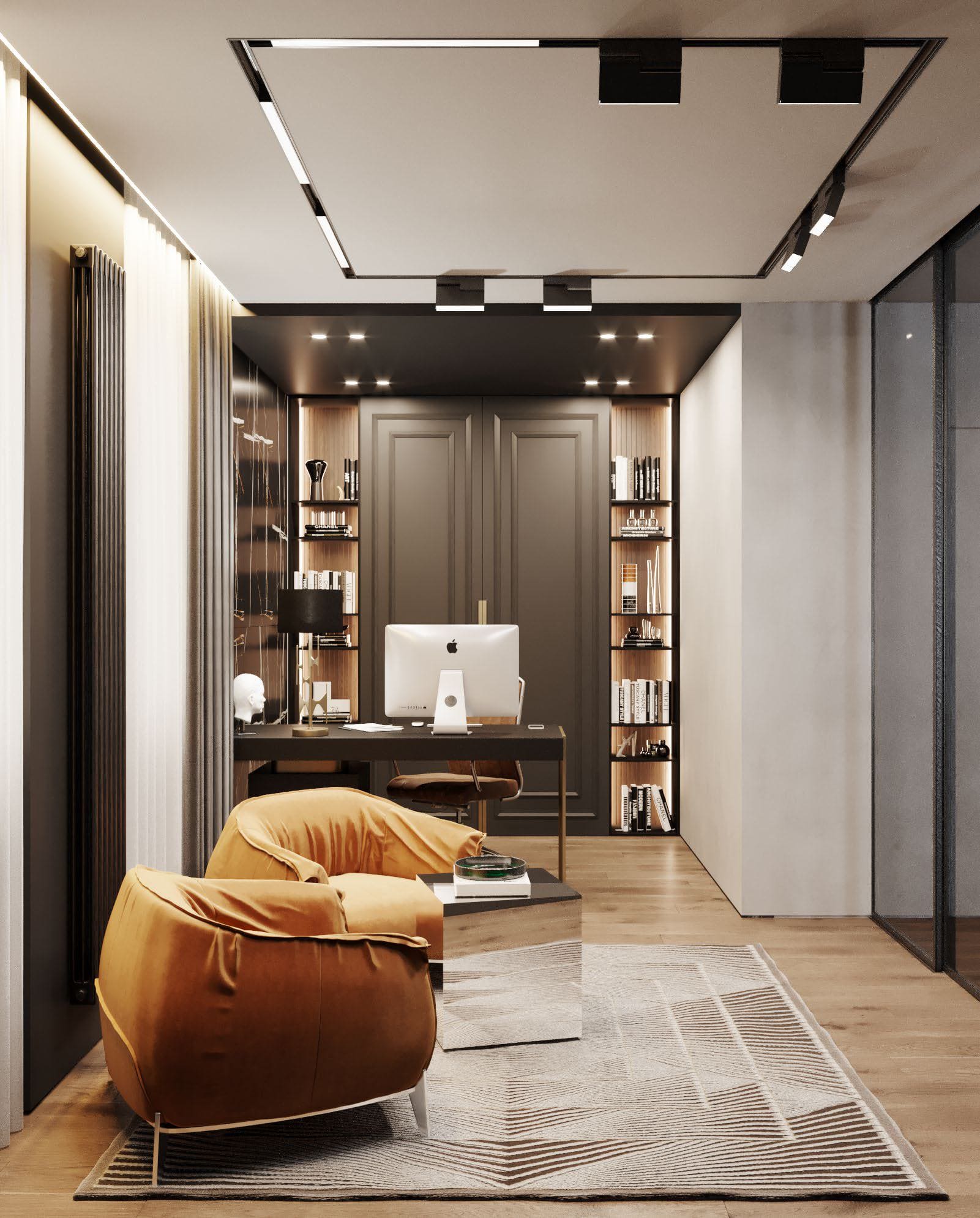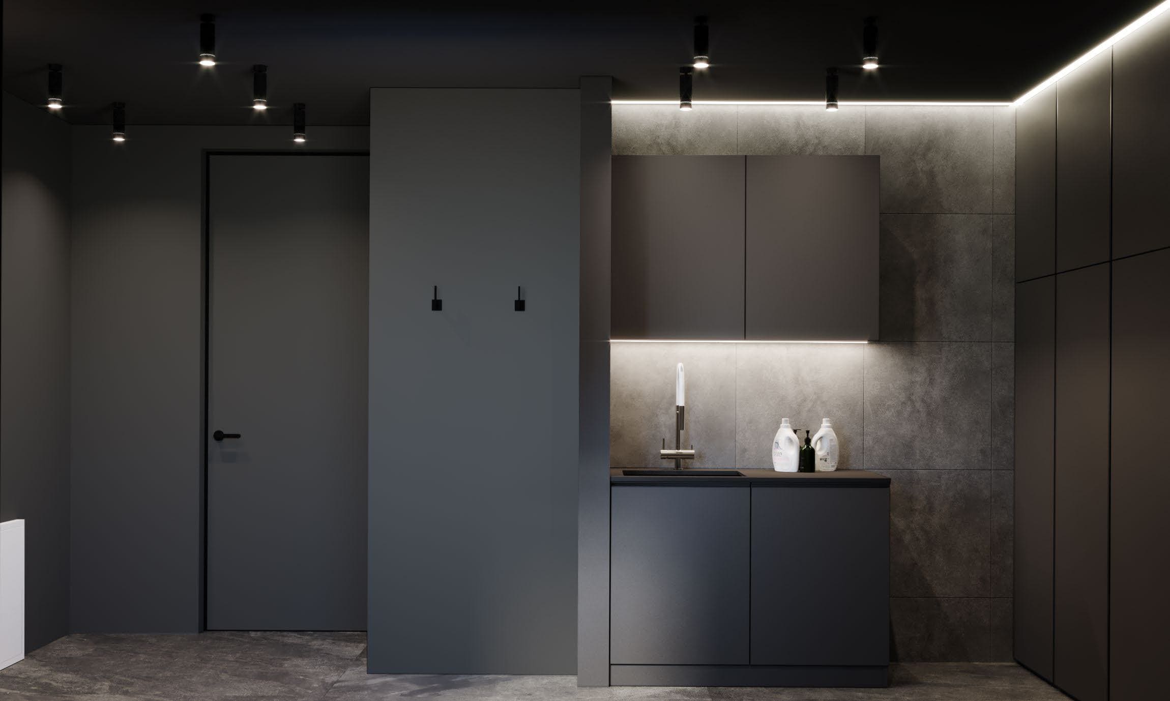 Проект для молодого человека, который любит последние тенденции. Пожелание: сделать современно и с эффектом «вау». Интерьер выполнен на контрасте. Задействованы как светлые, так и темные оттенки. Применили эко-освещение, гипсовые панели с подсветками, необычный декор, стену под камень.