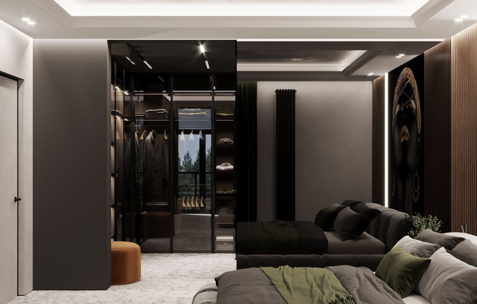 Особенностью спальни клиента стали подвесные светильники в виде луны. Лестница, соединяющая первый и второй этажи, также служит не только функциональным элементом интерьера, но и важным эстетическим элементом. Она получилась парящей, имеет свое освещение, а также линии подсветки на стене.